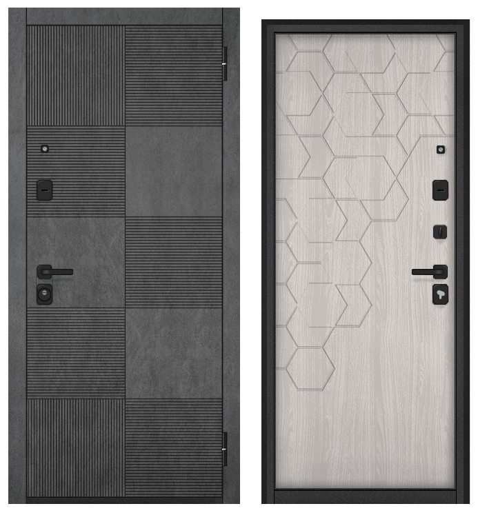 Бульдорс ТРАСТ ЭКО, МДФ бетон темный 9Е-173, МДФ ясень ривьера айс 9Е-184 (2050*960, правая, Ночная задвижка, букле антрацит, черн.фурн)