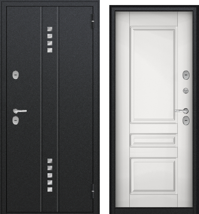 Тульские двери Б45 Термо АРКТИКА (2050*960, правая, черн. букле,нерж декор, МДФ12мм фреза Б-122,ПВХ белая гладк.фурн хром)