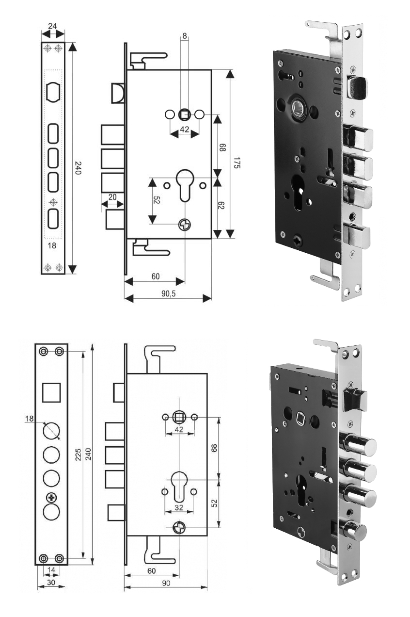 Замок врезной цилиндровый 632 с прямоугольными ригелями