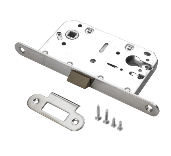 Замок врезной РЕНЦ с корпусом из оцинкованной стали, межосевое расстояние 85 мм, бэксет 50 мм, снабжен отверстиями под стяжные винты.