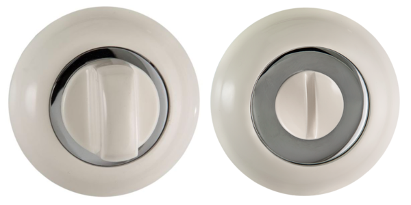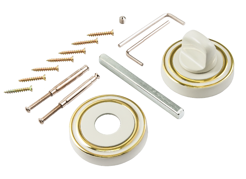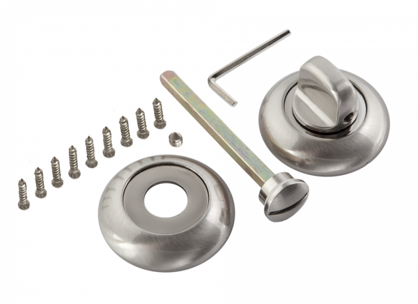 Завертка выполнена в стилистике дверных ручек, имеет тот же цвет, аналогичную форму розетки и снабжена удобным поворотным вертушком.